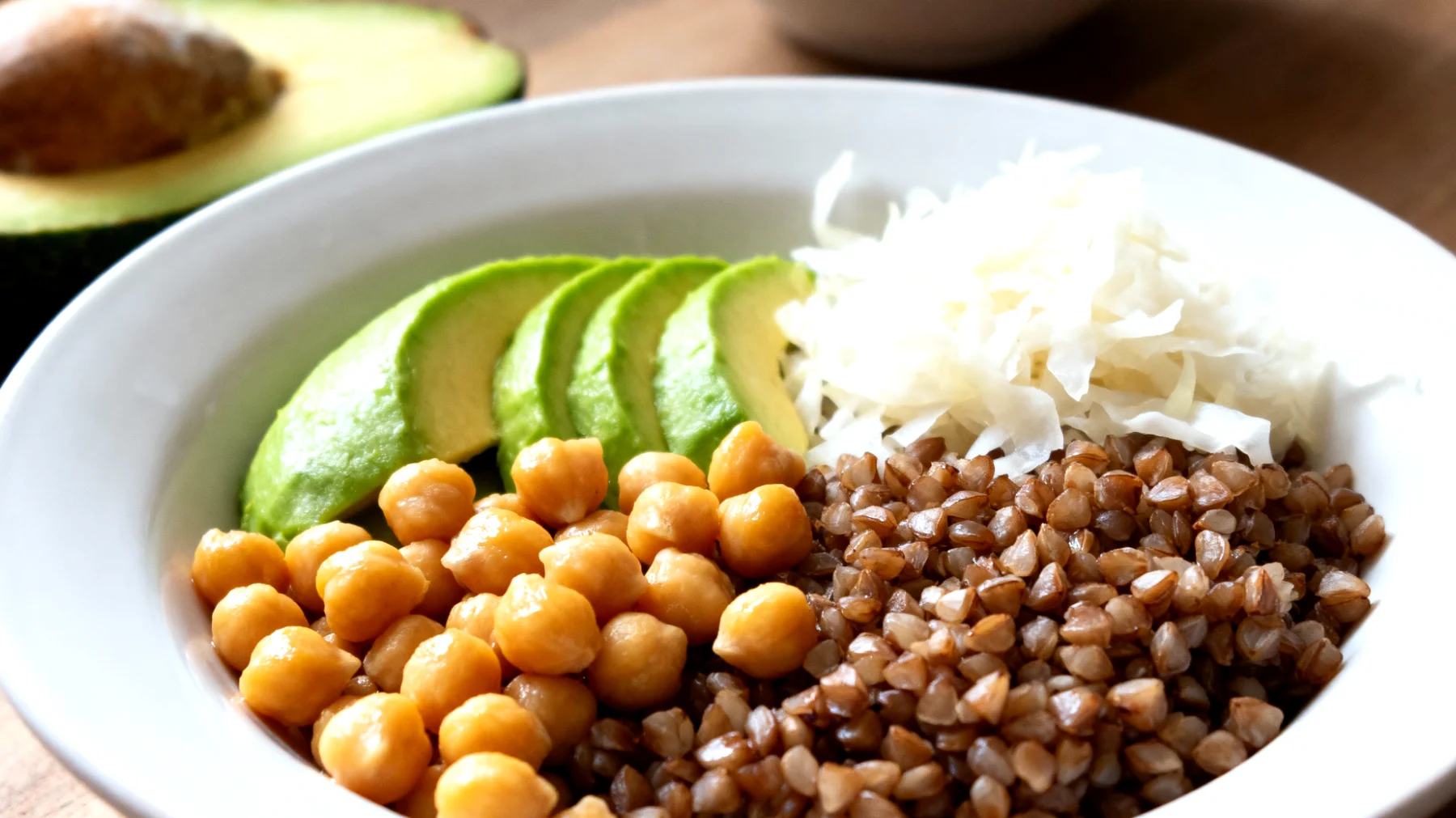 Eine gut zusammengestellte Bowl mit etwa 150 Gramm gekochtem Buchweizen, 120 Gramm Kichererbsen, einer halben Avocado und einer Portion Sauerkraut liefert rund 500 bis 600 Kilokalorien – ideal für ein ausgewogenes Mittagessen mit mittlerem Energiebedarf. Die komplexen Kohlenhydrate werden langsam verdaut und sorgen für stabile Blutzuckerwerte über mehrere Stunden hinweg. Kichererbsen haben zudem einen niedrigen glykämischen Index, was zusätzlich zur gleichmäßigen Energieversorgung beiträgt.
