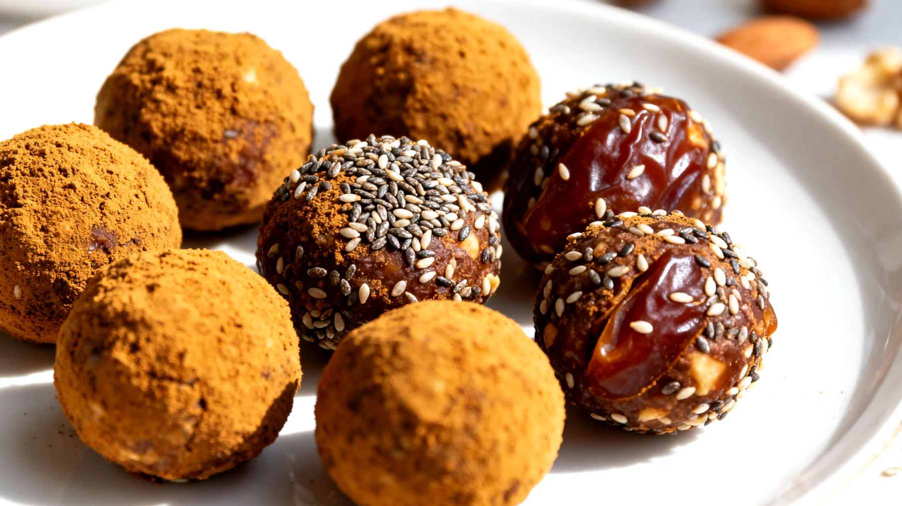 Mandeln, Walnüsse, Haselnüsse und Cashews liefern hochwertige pflanzliche Proteine und gesunde Fette, vor allem einfach ungesättigte Fettsäuren. Diese Fette verzögern die Magenentleerung und sorgen dafür, dass die Energie aus den Datteln gleichmäßiger freigesetzt wird. Zudem enthalten Mandeln beachtliche Mengen Magnesium – ein Mineralstoff, der für die Energieproduktion in den Zellen unverzichtbar ist.